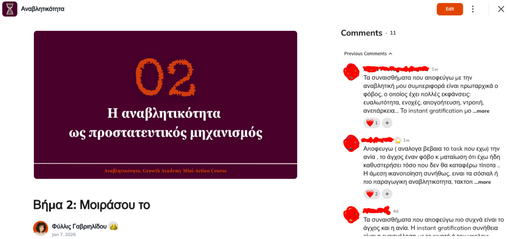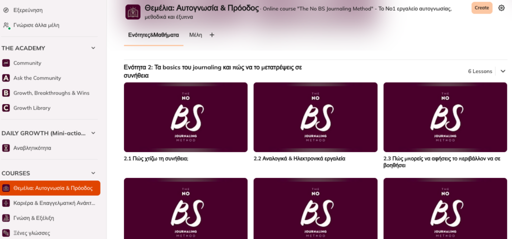 Δεν είναι άλλο ένα membership με “περιεχόμενο”. Είναι μια συλλογή από συστήματα που σε βοηθούν να μπεις σε δράση – ένα βήμα τη φορά. Με την απαραίτητη ψυχολογική ασφάλεια που οδηγεί σε αλλαγή.